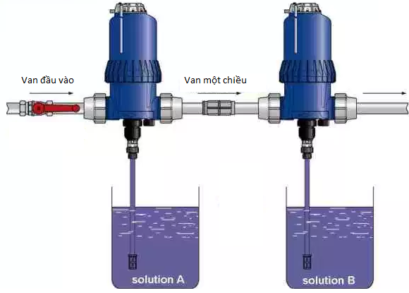 Lắp đặt chung (tùy vào số lượng hóa chất cần trộn). Lưu ý là một bơm định lượng chỉ dùng với một hóa chất, trừ khi thùng chứa hóa chất đã được trộn sẵn nhiều loại hóa chất theo tỉ lệ chính xác đã định trước.